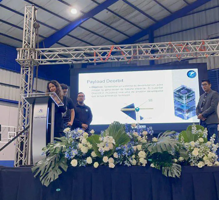 Durante la actividad, Héctor Gómez, Project Manager del proyecto QUETZAL-2, presentó la metodología de desarrollo y los subsistemas que conforman al satélite, resaltando la importancia de construir un nuevo satélite guatemalteco que impulse las capacidades tecnológicas y de innovación del país.